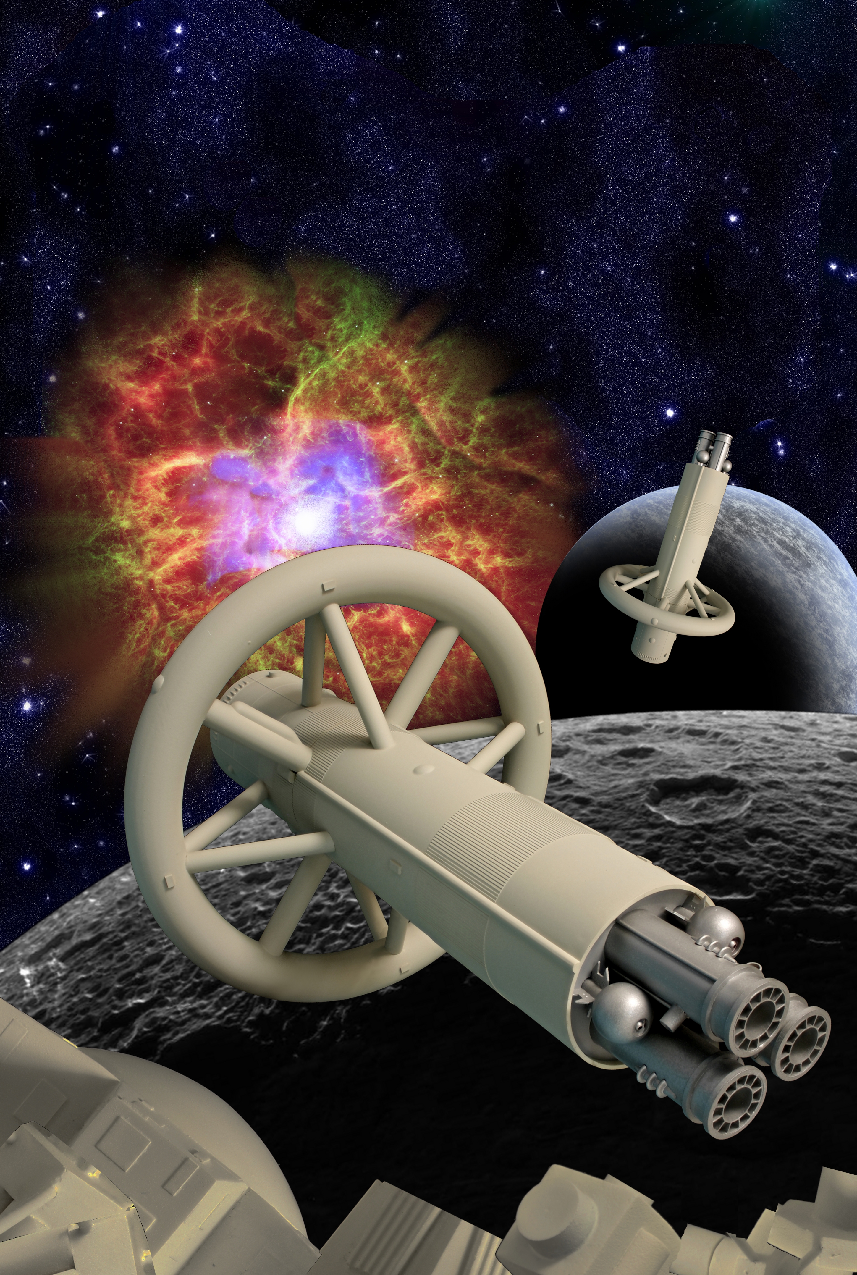 This is my recreation of the uncropped cover of Antares Dawn using photos of my model and astronomical images. The space station at the bottom of the picture was assembled from pieces of my StarForce ring-ship model.
